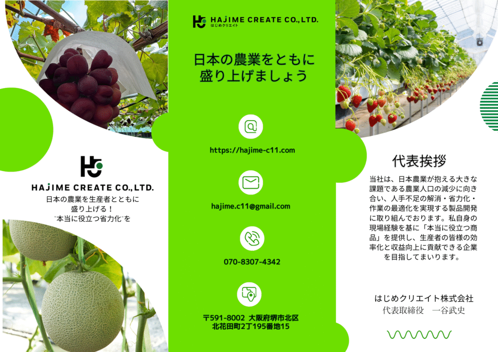 弊社は、日本農業が抱える深刻な課題である農業人口の減少に対応すべく、農業資材の開発を進めております特に「人手不足の解消」「労働時間の短縮」「農作業の最適化」に着目し、現場のニーズに即した製品開発を目指しております。