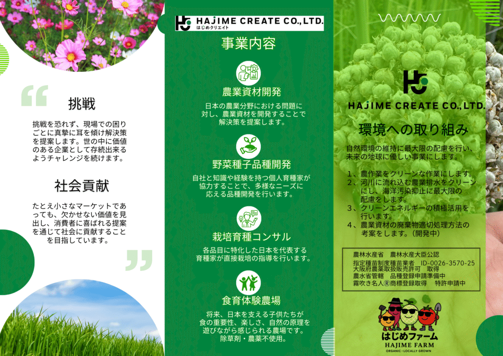 事業内容 | ・オリジナル農資材開発 ・自然農、有機栽培向け農業資材開発 ・農業資材販売 ・ブリーディング事業 ・はじめファーム(食育体験農場) ・自動車向け空間抗菌剤の開発 ・韓国コスメ代理店 ・キャンプ場開発(準備中) ・不動産事業 ・野菜栽培コンサル(トマト、メロン、タマネギ、ユーストマ) |